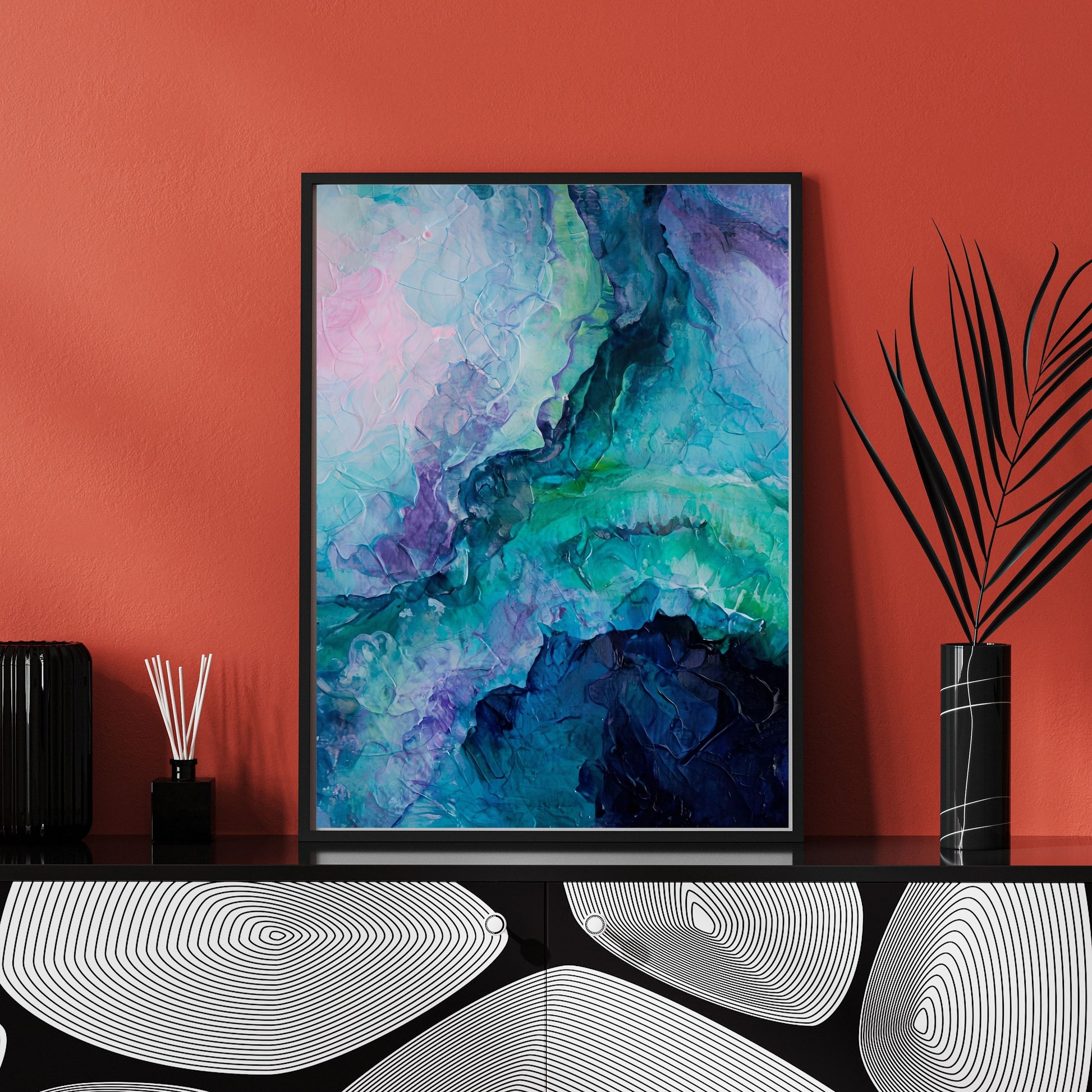 Energize your space with this abstract painting featuring vivid cool hues and dynamic texture. A striking modern artwork perfect for contemporary interiors.